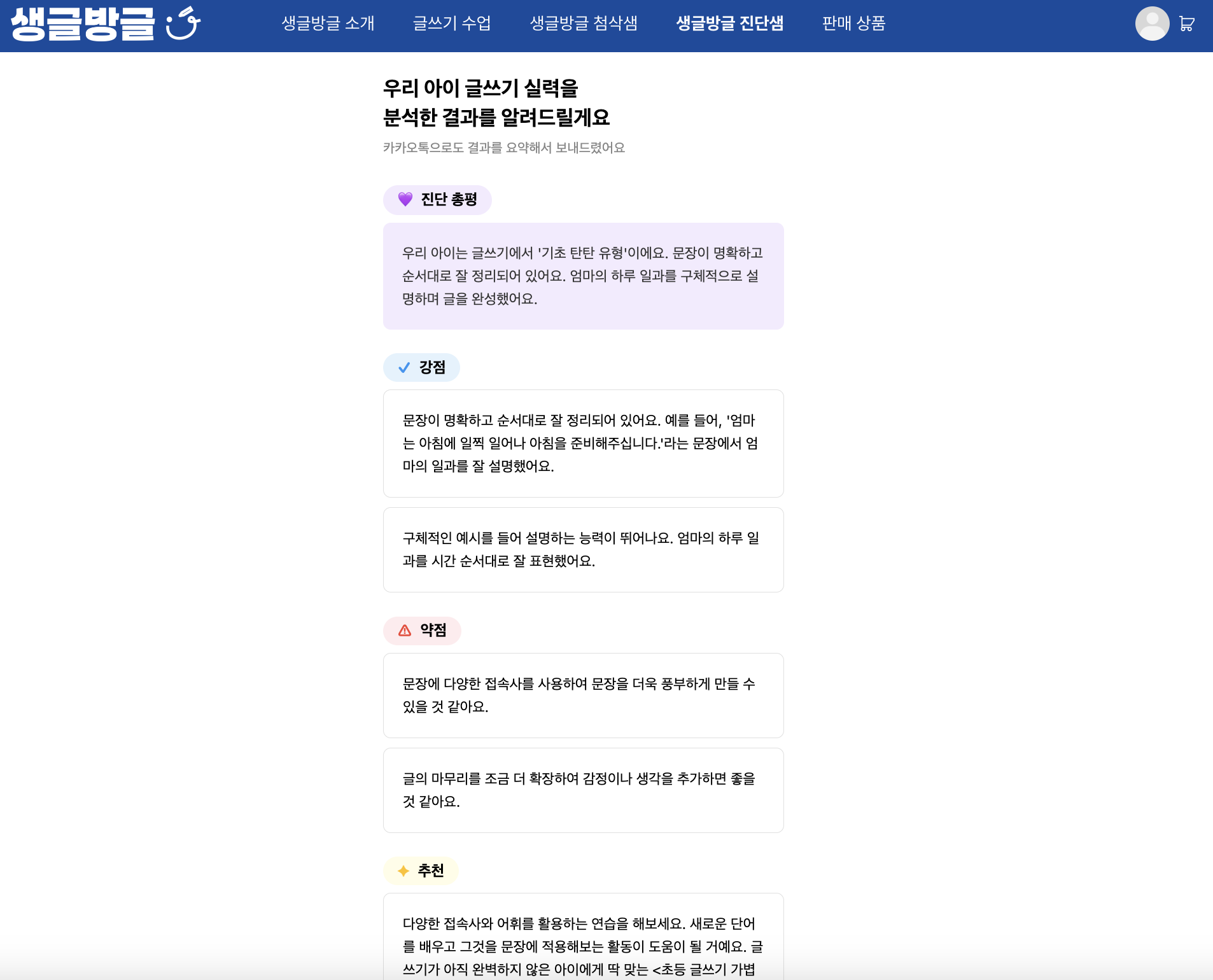 초등 글쓰기 실력 쑥쑥! 우리 아이의 글쓰기 진단부터 피드백까지 한번에 해결하세요. 더 자세한 내용을 확인해보세요! 독서논술 서비스 생글방글